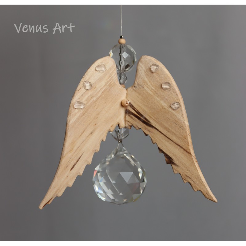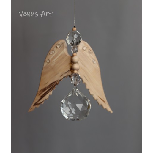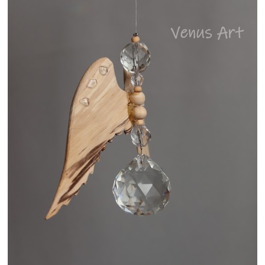 Tělíčko andílka je vyrobeno ze skleněného ověsu průměr 3 cm z křišťálového skla. Doplněn dřevěnými korálky, vyřezávanými dřevěnými křídly s kamínky pravého křišťálu.