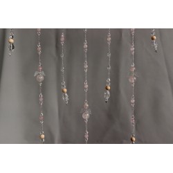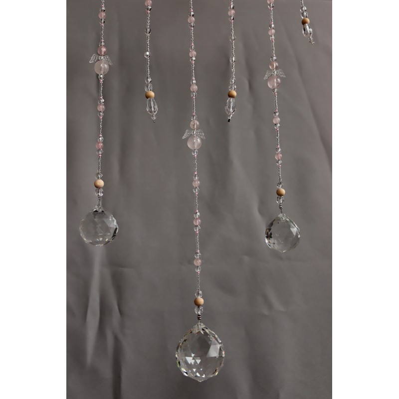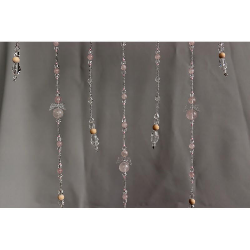 Dekorace do interiéru zdobená kamínky i kuličkami /průměr 6 až 14 mm/minerálu Růženín, korálky ze skla a dřeva. Se třemi andílky z Růženínu.