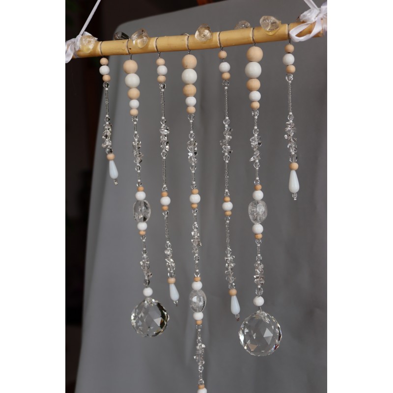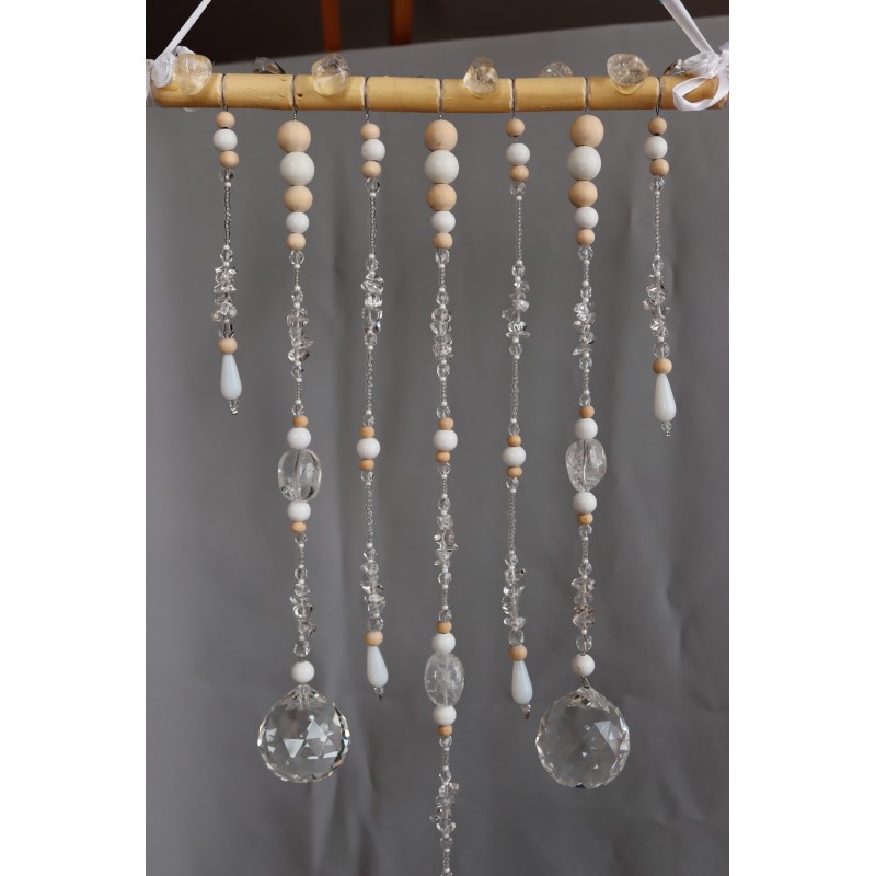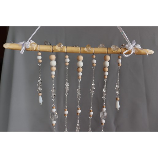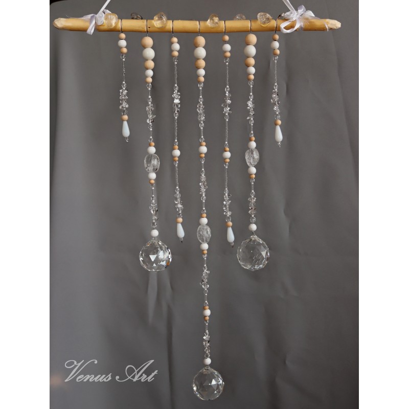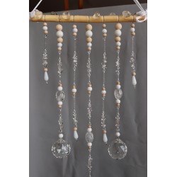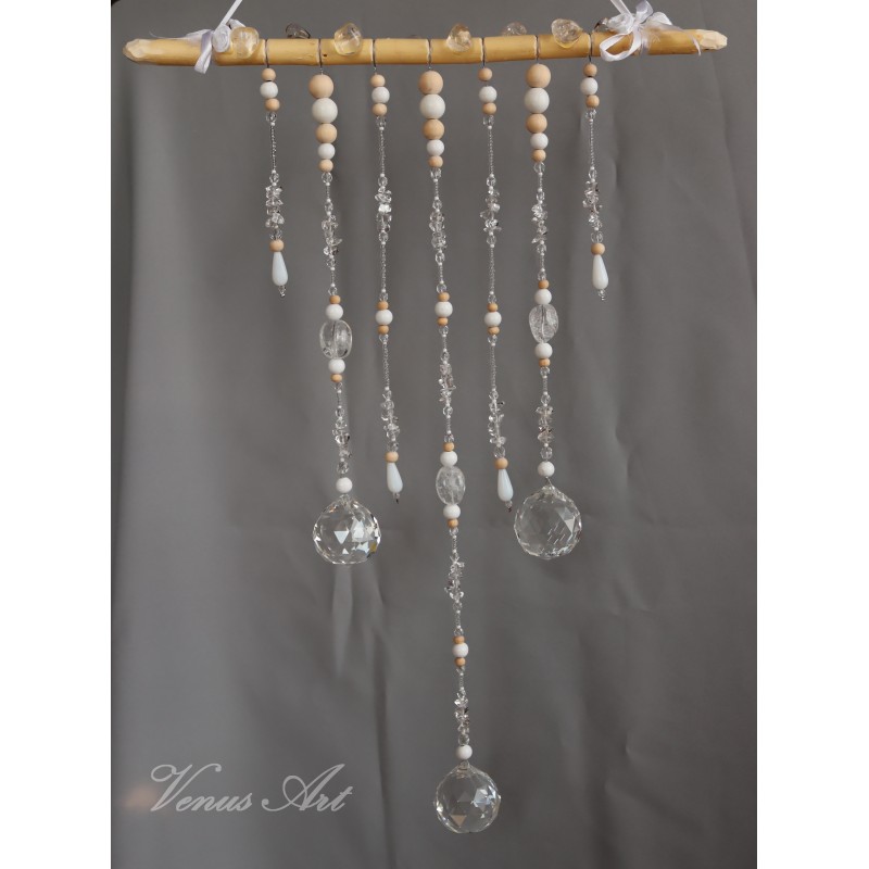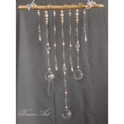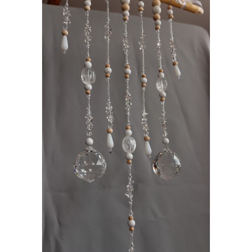 Na ručně opracované větvi jsou zavěšeny tři křišťálové koule /průměr 4cm/ z křišťálového skla. Doplněné kuličkami ze dřeva, skleněnými korálky.
