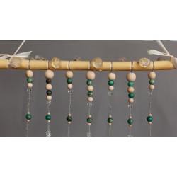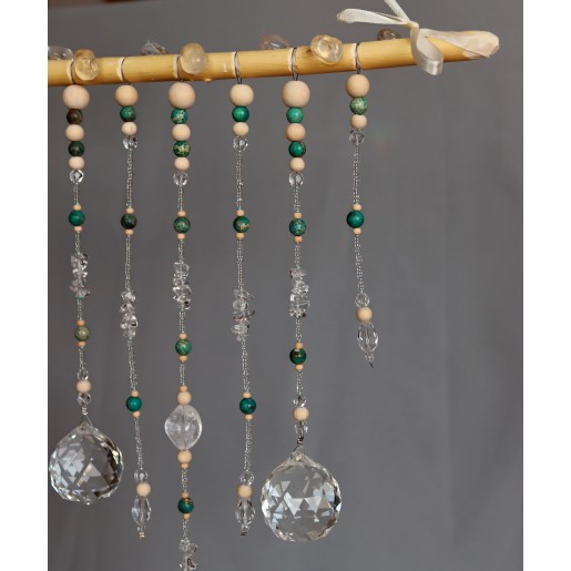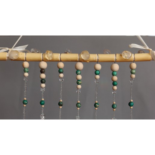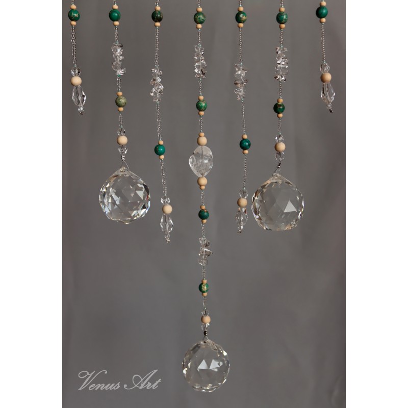 Dekorace do interiéru zdobená kamínky a zlomky minerálu KŘIŠŤÁL AA kvalita - větší, lesklejší kousky, kuličkami BARVENÝ JASPIS/, korálky ze skla a dřeva.