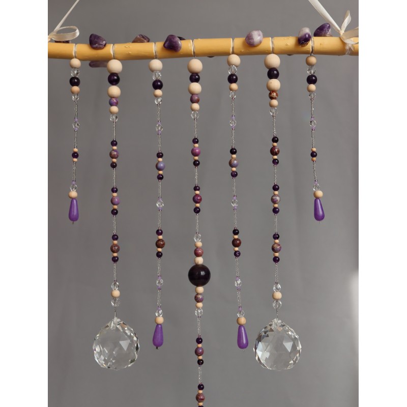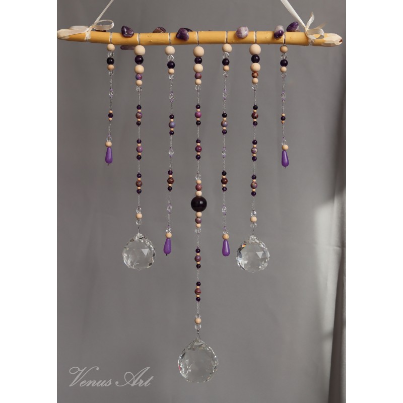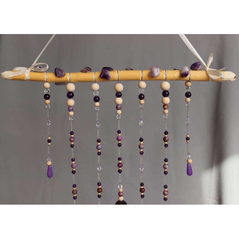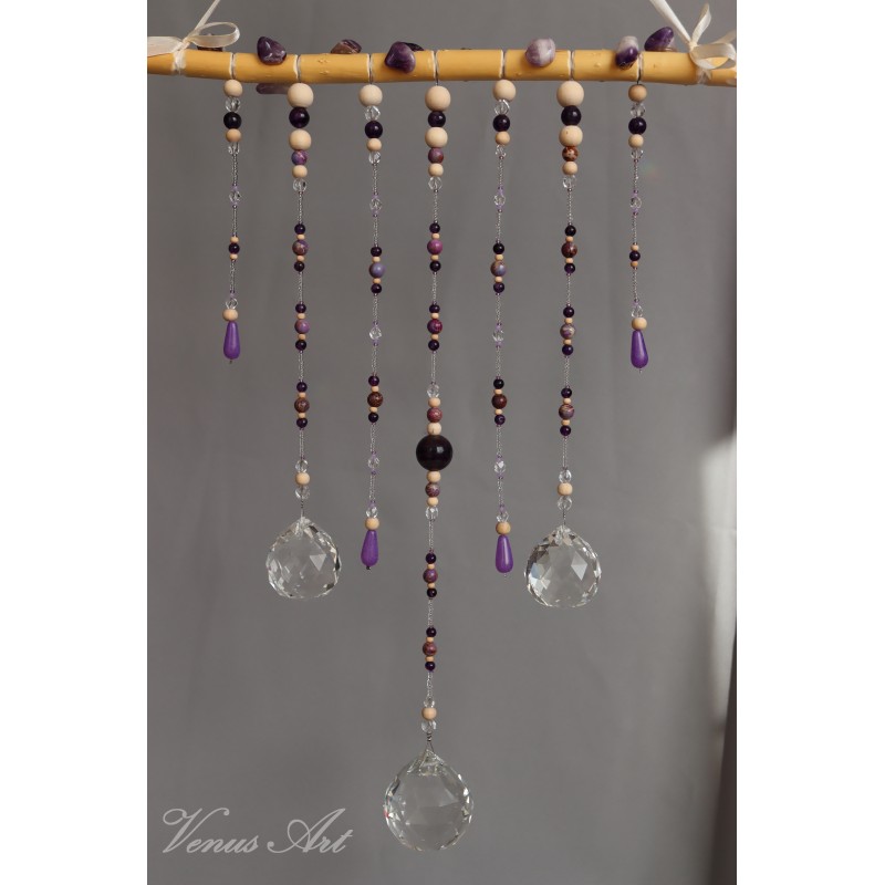Dekorace do interiéru zdobená kamínky a korálky minerálu AMETYST /průměr 6mm,8mm/,BARVENÝ JASPIS /průměr 8mm/, uprostřed dominantní kulička průměr 2cm FIALOVÝ FLUORIT, dále korálky ze skla a dřeva.