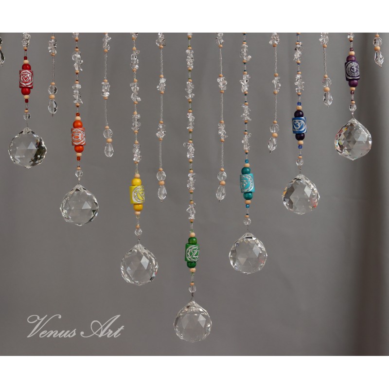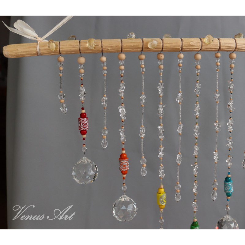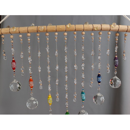Na ručně opracované větvi je zavěšeno sedm feng shui koulí /průměr 4cm/ z křišťálového skla.