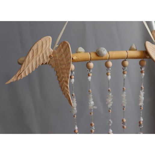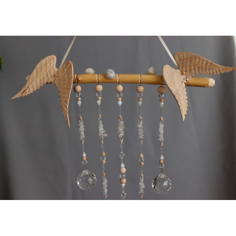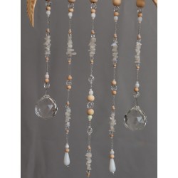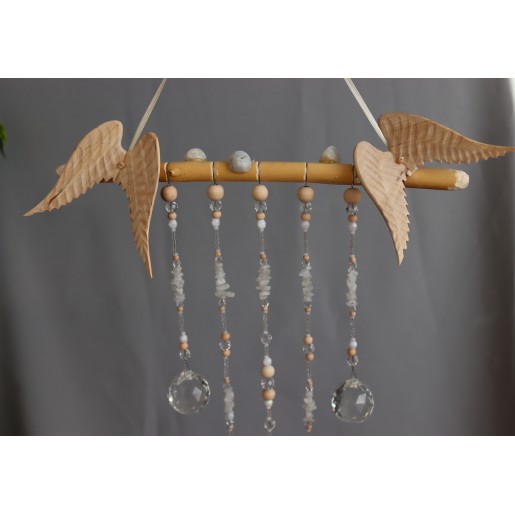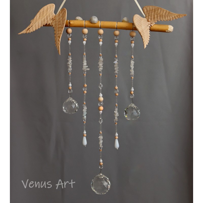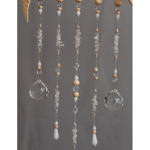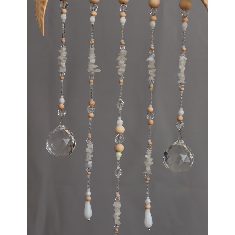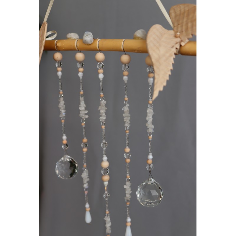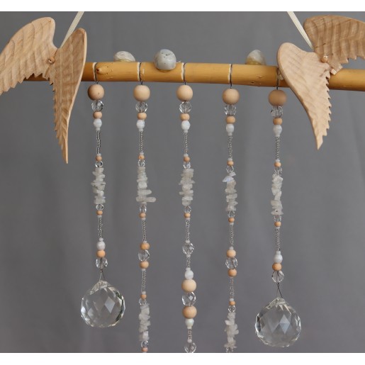 Na ručně opracované větvi jsou zavěšeny tři křišťálové ověsy z křišťálového skla 3cm a 4cm. Doplněné skleněnými a dřevěnými korálky.